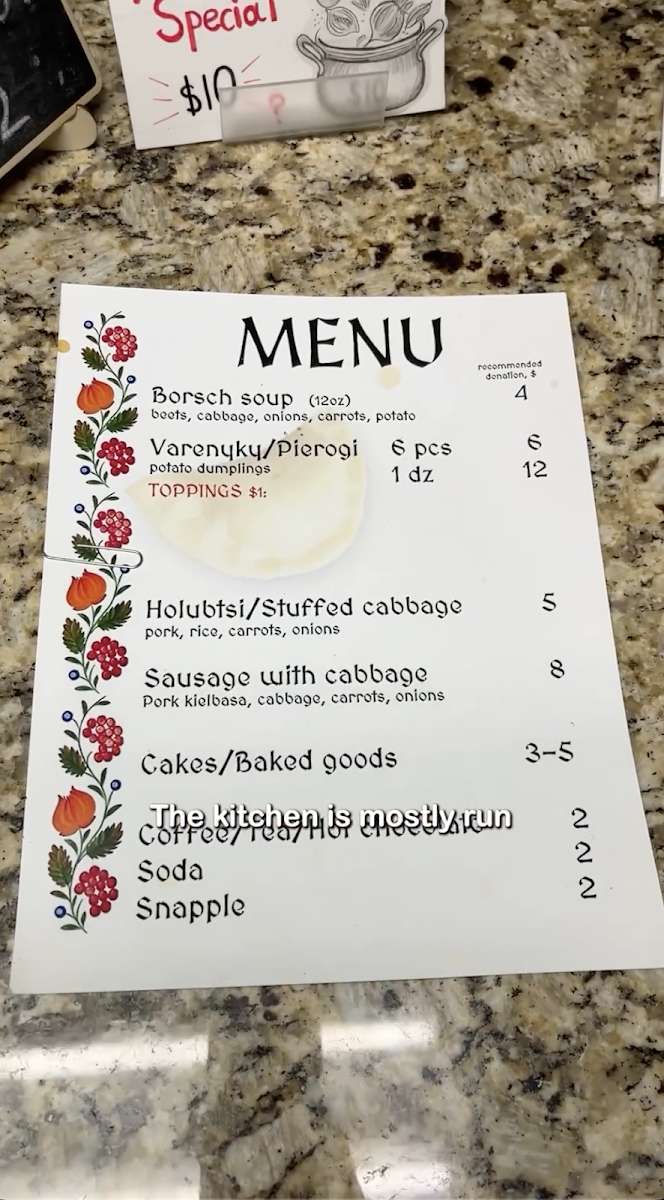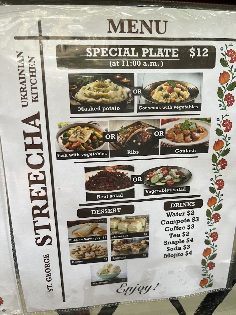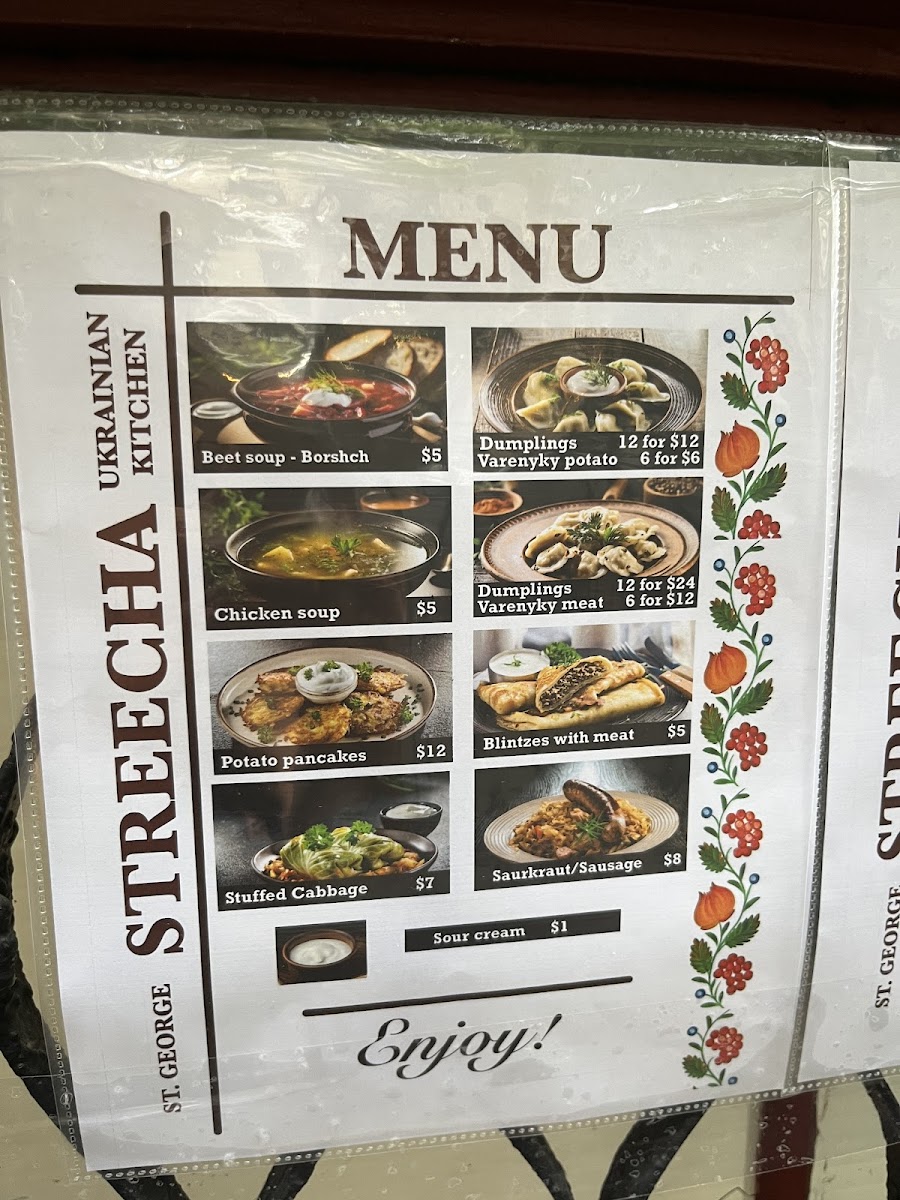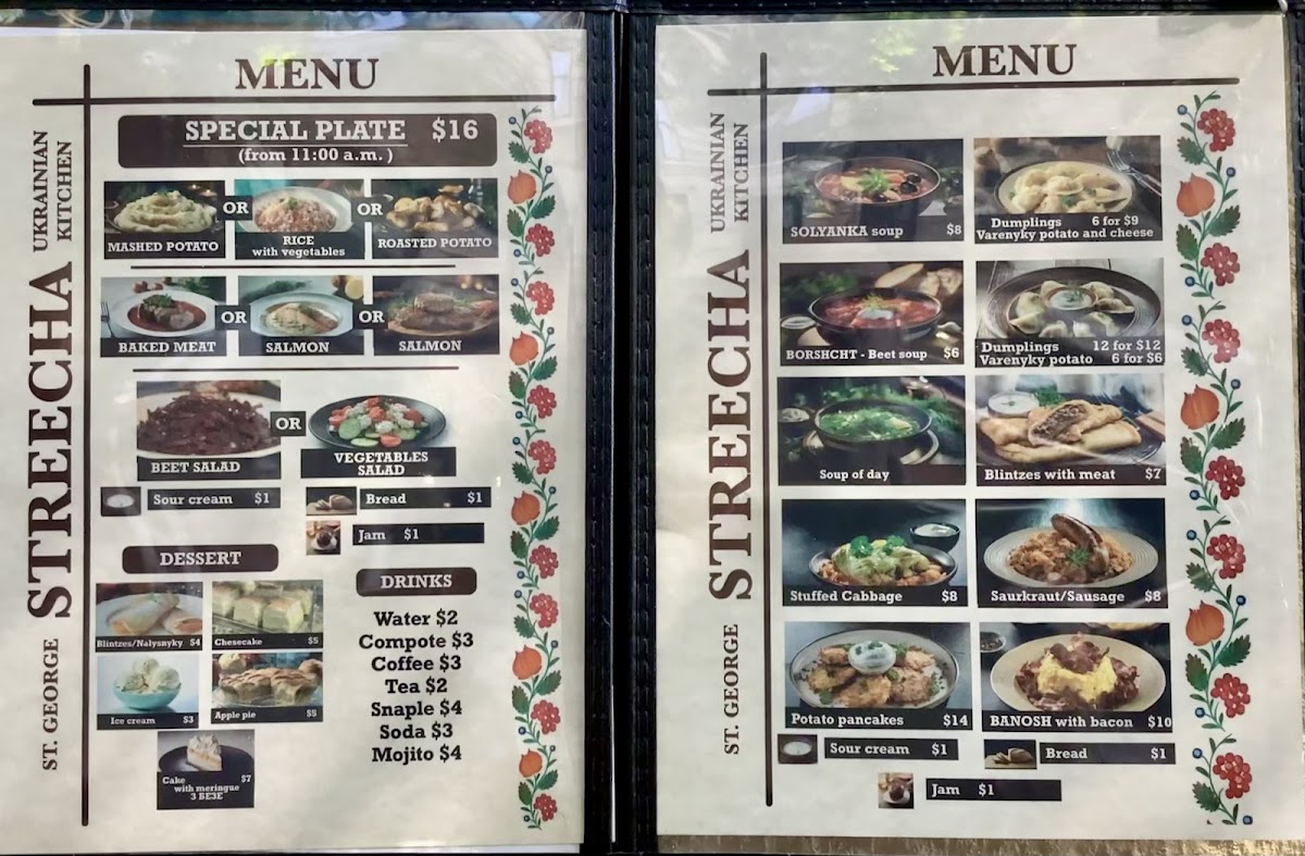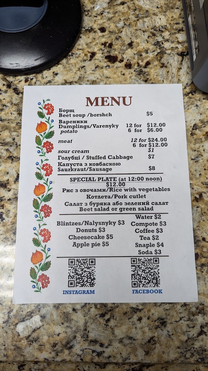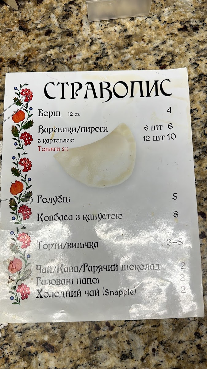 Highlights include hearty classics like varenyky (dumplings), pierogi, and borshcht, alongside daily specials that capture the season’s best. Signature dishes such as stuffed cabbage, sauerkraut with sausage, and potato pancakes offer a satisfying taste of home-style cooking, while lighter options and soups provide comfort on cooler days.